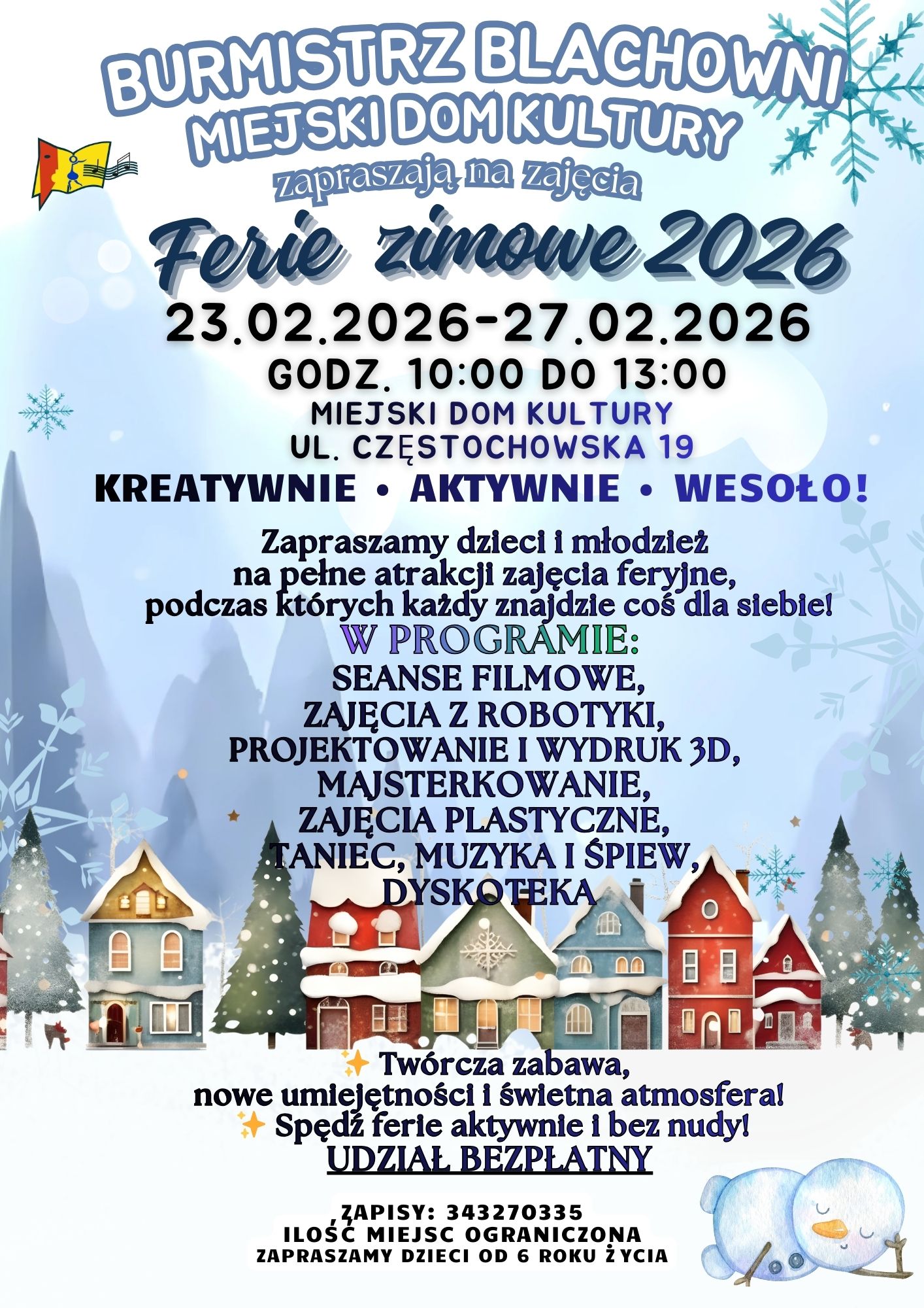16 lutego dla uczniów m.in. woj. śląskiego rozpoczynają się ferie zimowe. Burmistrz i MDK zapraszają dzieci od 6 roku życia do spędzenia wolnego czasu od nauki. Co może wyjątkowo ucieszyć dzieci – zajęcia są darmowe.